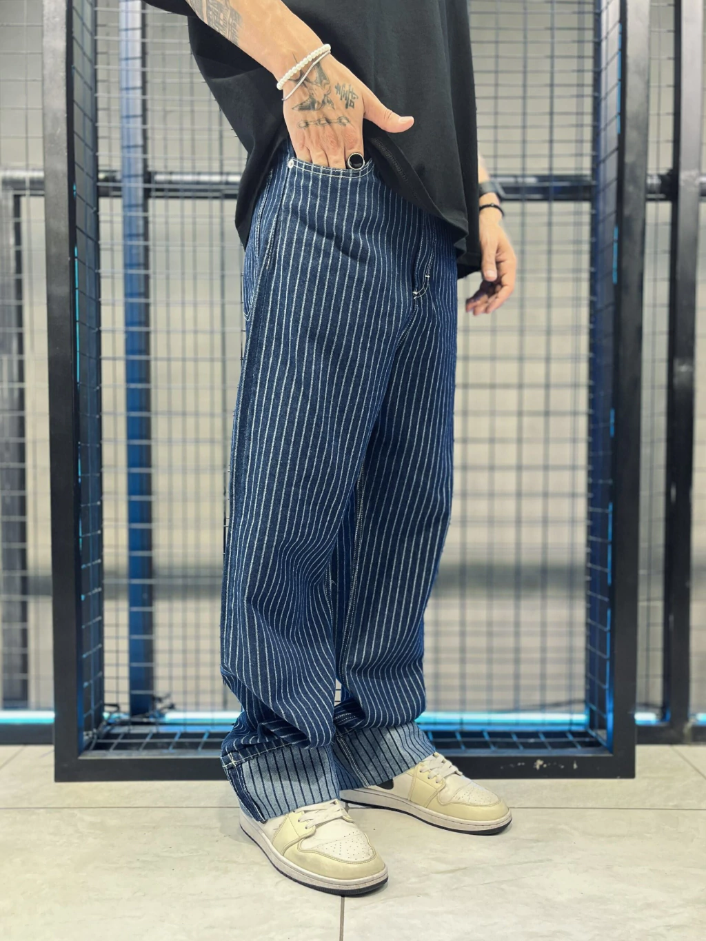 Este jean es todo lo que necesitas para un look relajado pero con mucha onda. Con un calce cómodo y baggy súper en tendencia. Y lo mejor, tiene un diseño rayado que le da el flow que buscabas. Combínalo con una Remera Trasher In Praesential y estas ready ⚡