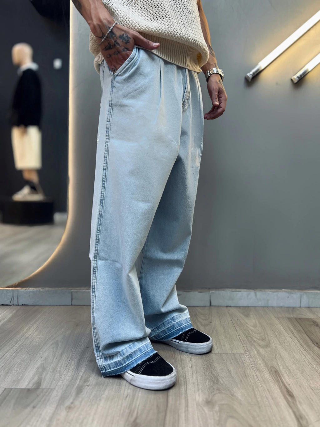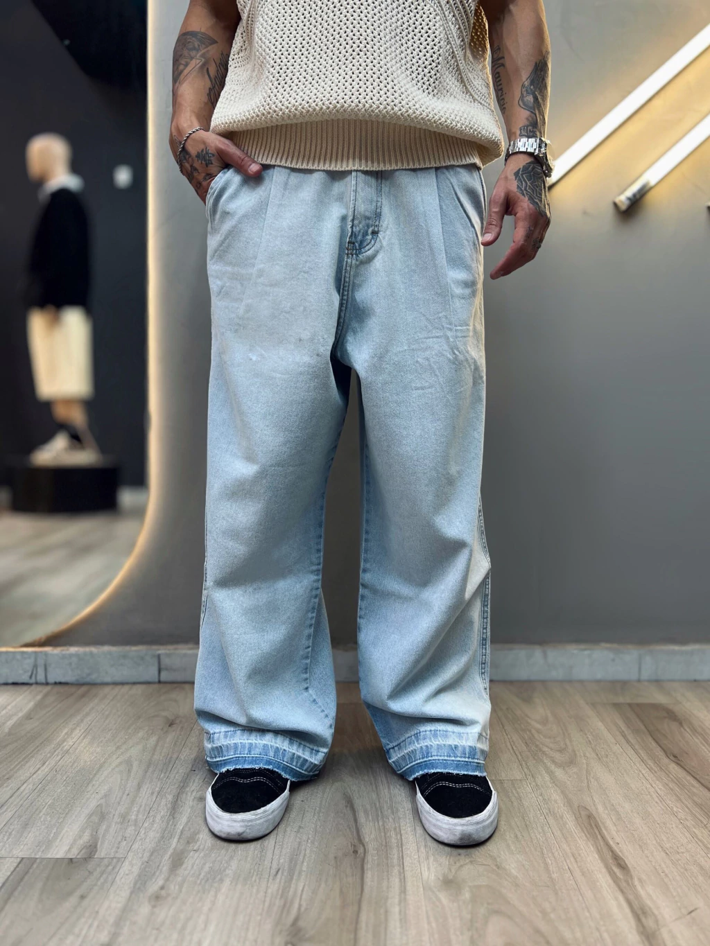 Jean celeste de corte recto con detalle estampado sutil estilo cocodrilo, que le da un toque único y sofisticado sin perder la versatilidad del día a día. Ideal para looks streets y frescos, combinable con remeras, tops o camisas 💣😎
