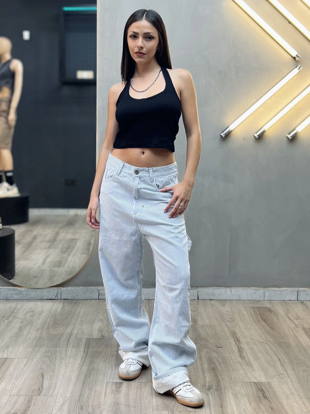 Para referencia de medida, la modelo mide 1.58m, usa Talle S.